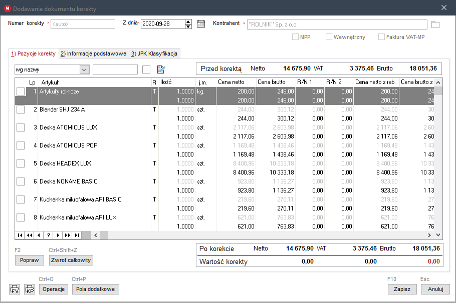 - Zarejestrować dokument faktury korygującej od dostawcy, wybierając towary z właściwej dostawy.