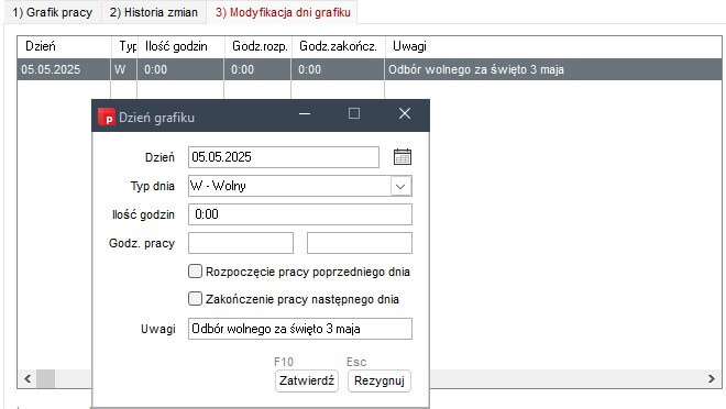 Jeśli pracodawca dopuszcza odbiór dodatkowego dnia wolnego w dowolnym dniu okresu rozliczeniowego, najlepszym rozwiązaniem jest zmiana kalendarza/grafiku dla każdego pracownika. Dzień wolny oraz zerową liczbę godzin pracy na wybrany przez pracownika dzień można wprowadzić po przejściu do widoku Dane podstawowe | Grafik pracy | zakładka Modyfikacja dni grafika.