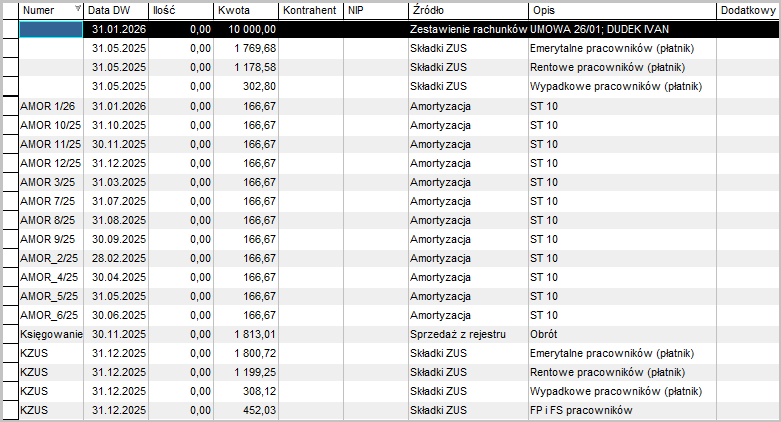 Aby program poprawnie wyliczył i wstawił kwotę składek społecznych zaliczonych do kosztów uzyskania przychodu, konieczne jest dodanie specjalnego wyróżnika do każdej pozycji dowodu wewnętrznego, której wartość ma być podsumowana.