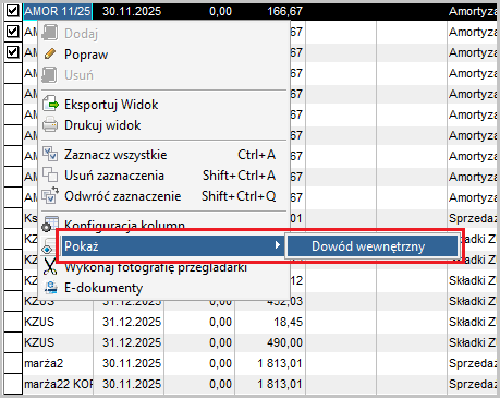 Z przeglądarki dowodów wewnętrznych można w analogiczny sposób przejść do przeglądarki pozycji przynależących do wybranych dowodów wewnętrznych.