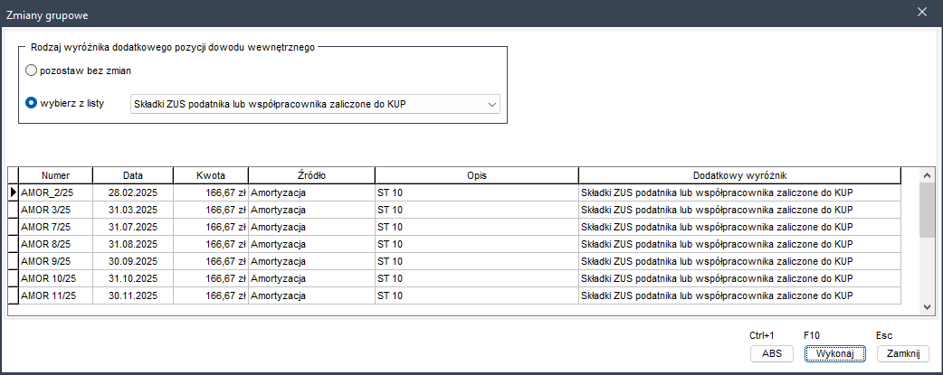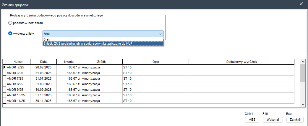 Aby dokonać zmian, należy w oknie Rodzaj wyróżnika dodatkowego pozycji dowodu wewnętrznego zaznaczyć opcję wybierz z listy, a następnie na liście rozwijanej wybrać pozycję Składki ZUS podatnika lub współpracownika zaliczona do KUP i kliknąć przycisk Wykonaj (F10). Po tej operacji program automatycznie przypisze odpowiednią wartość do zaznaczonych pozycji.
