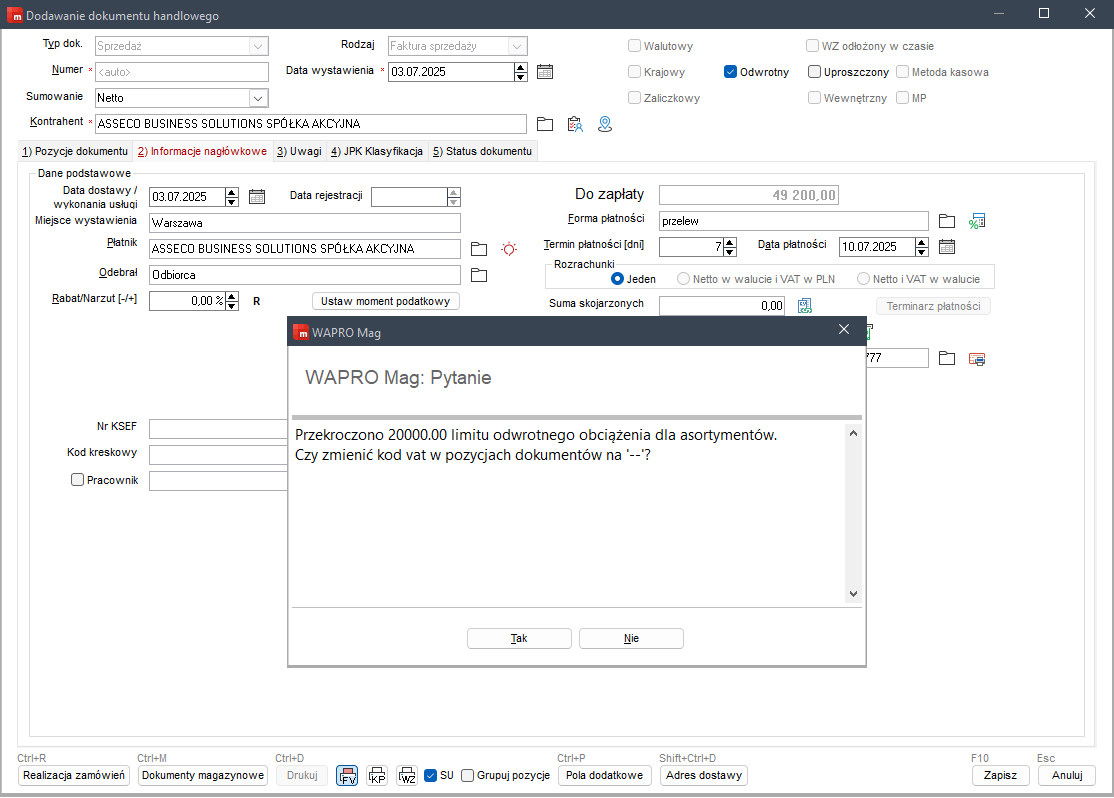 Wystawianie transakcji oznaczonych jako odwrotne obciążenie niczym się nie różni od wystawiania pozostałych transakcji. Po włączeniu znacznika Odwrotny na dokumencie oraz po wybraniu produktów podlegających OO z limitem, system w momencie zatwierdzania dokumentu wykona kontrolę i może wyświetlić dodatkowy komunikat.