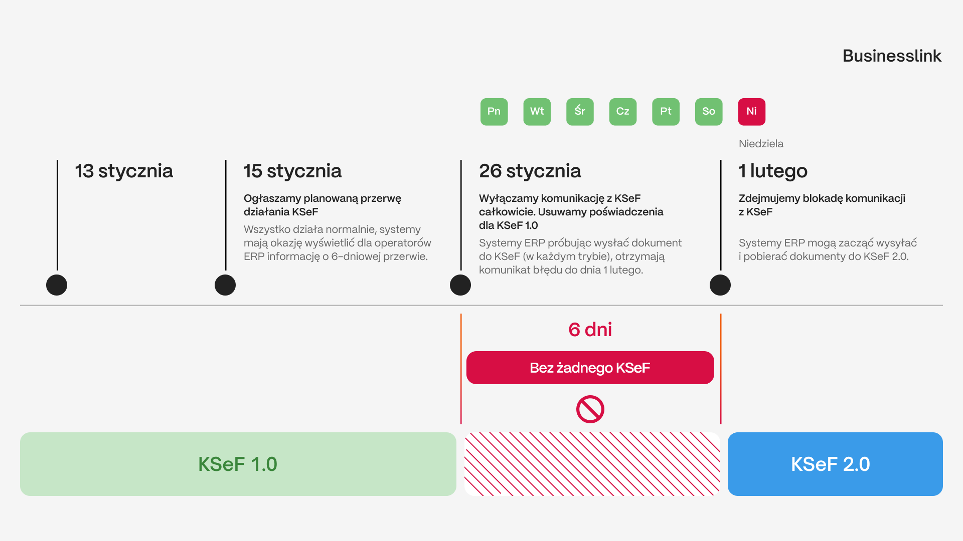 15 stycznia 2026 r. – w usłudze Businesslink wyświetli się komunikat z informacją o 6-dniowej przerwie w komunikacji z KSeF. 26 – 31 stycznia 2026 r. komunikacja z KSeF będzie niemożliwa.