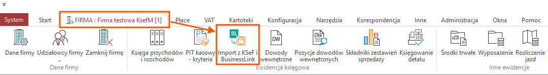 Aby przystąpić do księgowania dokumentów z KSeF należy z poziomu firmy uruchomić opcję Import z KSeF i BusinessLink.