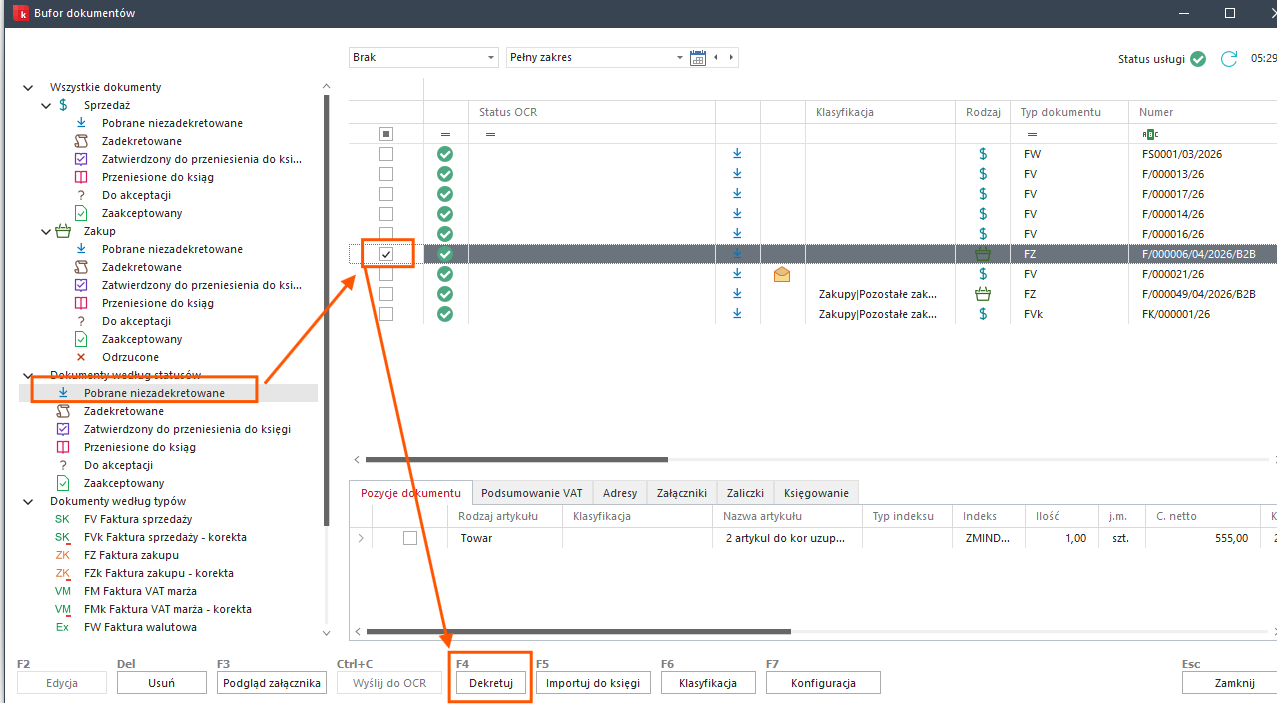 1. Dekretowanie – wstępne rozksięgowanie dokumentów w oparciu o wcześniej stworzoną konfigurację.
