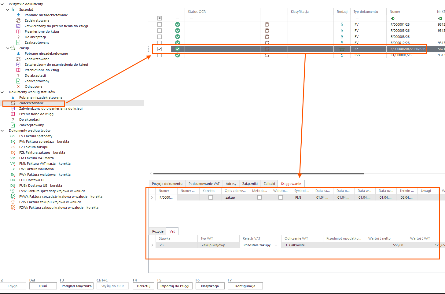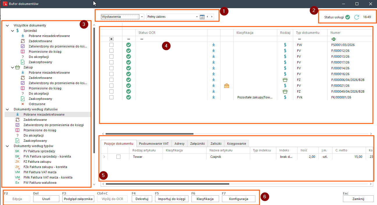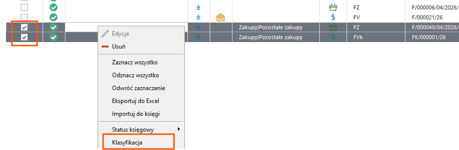• F6 (Klasyfikacje) – Klasyfikacje dokumentów. Przypisanie klasyfikacji pozwala na skonfigurowanie bardziej zawansowanej dekretacji.