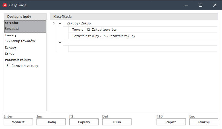 Okno zbudowane jest z dwóch części. Po lewej stronie za pomocą przycisku „Dodaj” można dodać kody klasyfikacji, które to mogą zostać użyte w drzewie klasyfikacji (po prawej stronie okna) wiele razy.