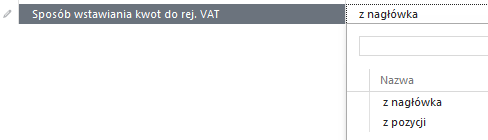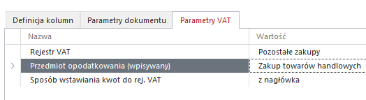 • Parametry VAT – parametry wg. Których dokument zostanie uwidoczniony w rejestrze VAT. Możliwość wyboru np. konkretnego rejestru VAT.