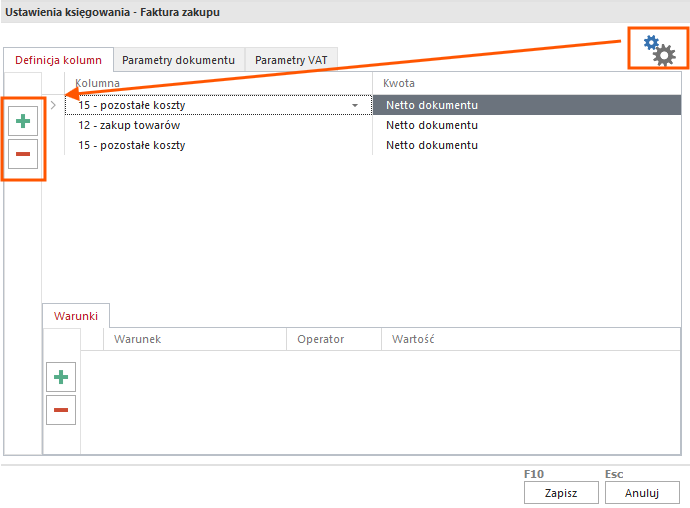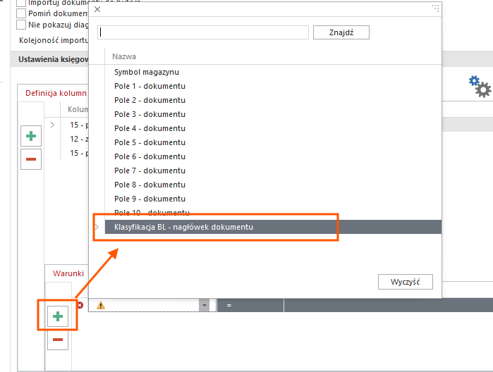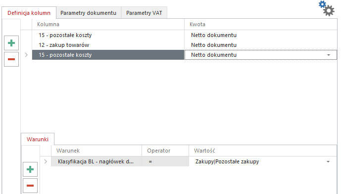 Pierwszy wpis wybieramy kolumnę podstawową, bez wybranego warunku. Tak aby w przypadku braku klasyfikacji system zapisał dokument do kolumny 15.
