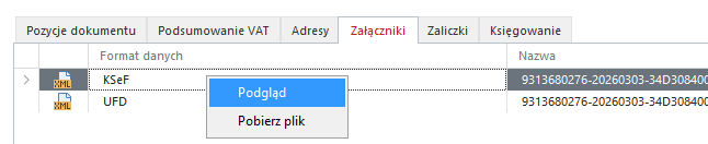 5. Szczegóły dokumentu. Tu można sprawdzić jakie pozycje są na dokumencie, w jakich stawkach VAT, od kogo. Można również na zakładce załączniki podejrzeć dokument klikając prawy przycisk myszy i wybierając opcję „Podgląd”.
