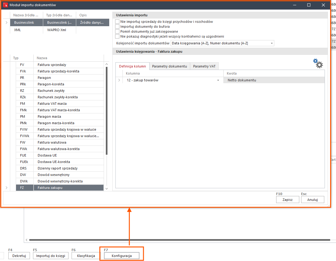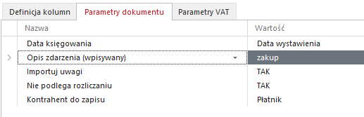 • Parametry dokumentu – parametry z jakimi ma zostać zaimportowany dokument do księgi.