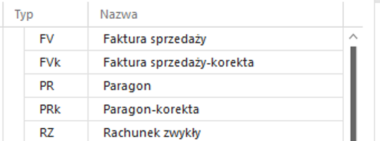 1. Sekcja typów dokumentów. Tu można wybrać typ dokumentu który użytkownik chce skonfigurować.